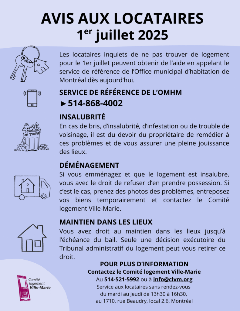 Grande période de déménagements et de stress, le 1er juillet est un moment parfait pour s’informer de ses droits en tant que locataire. Si vous n’avez pas trouvé de logement, n’hésitez pas à contacter l’Office municipal d’habitation de Montréal au 514-868-4002.