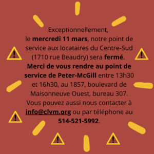 Le CLVM fermera donc son point de service aux locataires du Centre-Sud (1710 rue Beaudry) le 11 mars. Ce jour-là, le service aux locataires se fera dans nos locaux de Peter-McGill (1857, bd de Maisonneuve, local 307) de 13h30 à 16h30. Malheureusement, nous ne pourrons pas offrir de service sur rendez-vous en soirée.