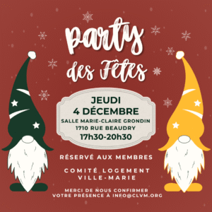 Le Comité logement Ville-Marie organise un party des fêtes le 4 décembre de 17h30 à 20h30 dans la salle Marie-Claire Grondin, au 1710 rue Beaudry.